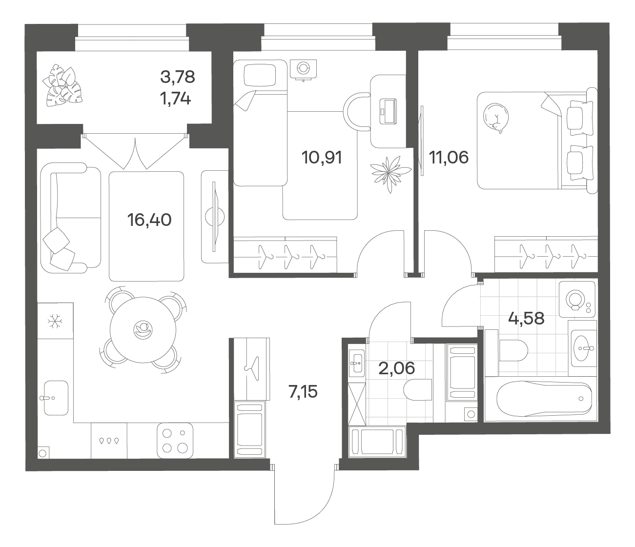 2-комнатная 53.9 м2