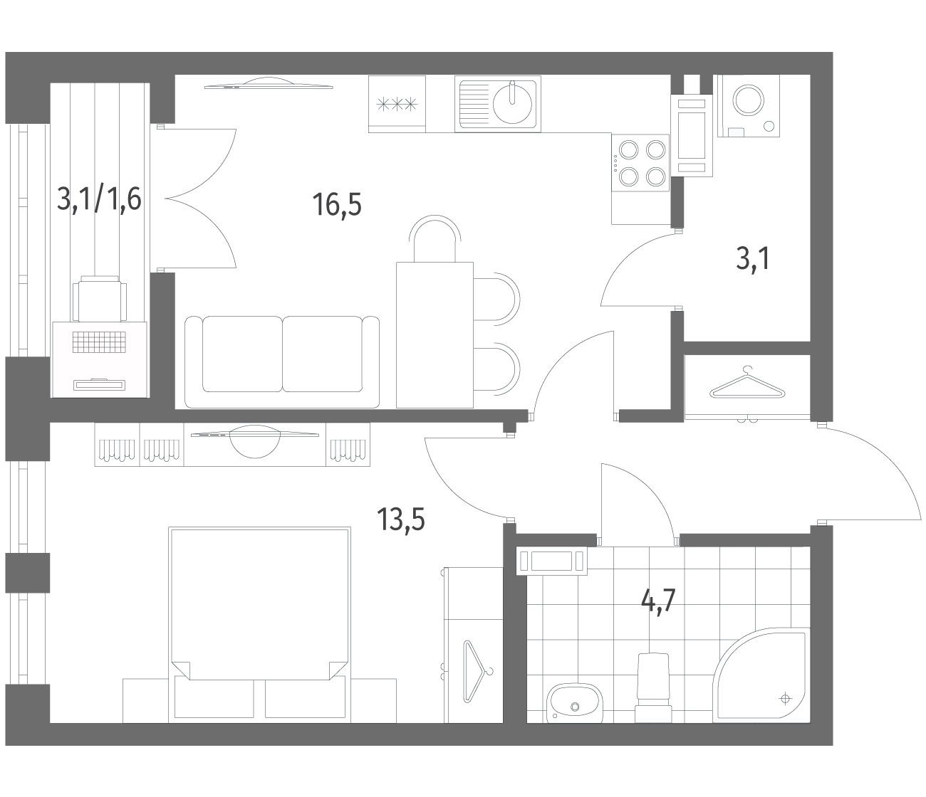1-комнатная 43.6 м2